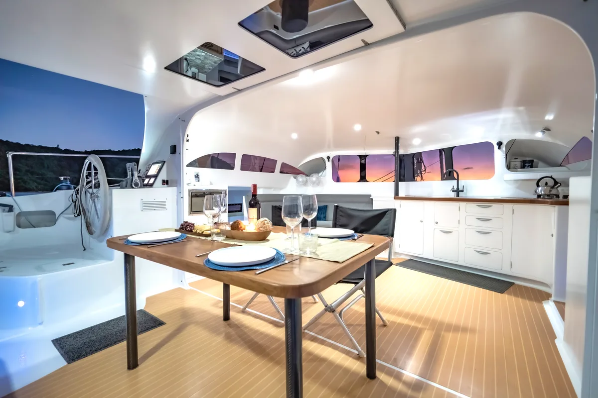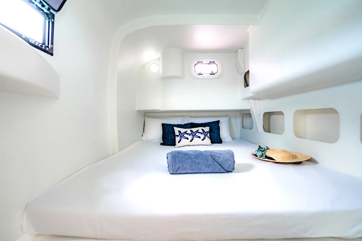 Hero รองรับผู้โดยสารได้สูงสุด 10 ท่านสำหรับทริปรายวัน ราคาพื้นฐานรวม 6 ท่าน — สามารถเพิ่มผู้โดยสารได้โดยมีค่าใช้จ่ายเพิ่มเติม For ค้างคืน charters, the yacht accommodates up to 4 ท่าน in 3 cabins (2 รวม in the base price).